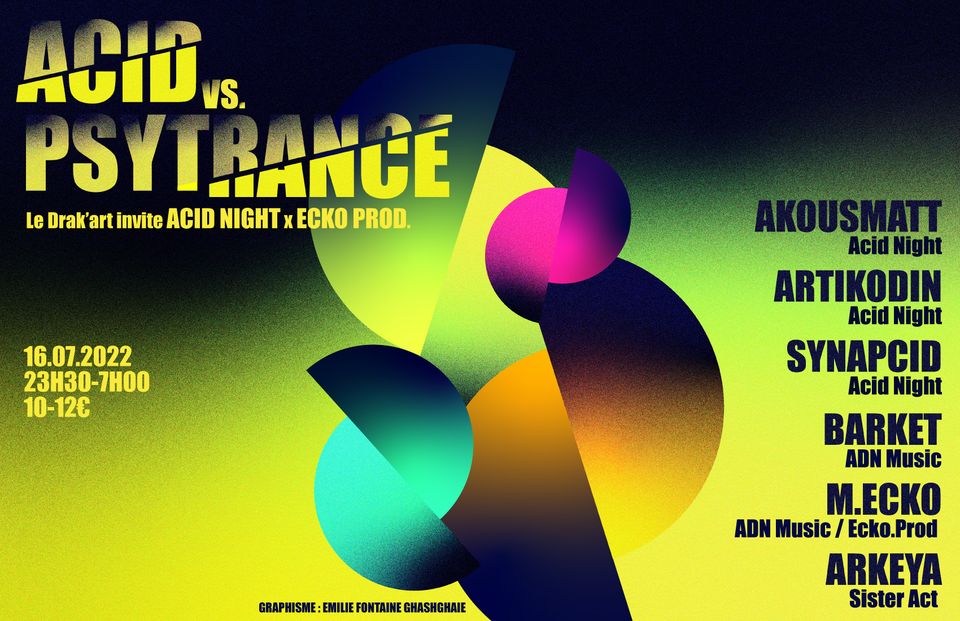 Pour la deuxième fois, Le Drak Art s’associe à Ecko Prod pour proposer une soirée psytrance vs acidcore avec la venue exceptionnelle du collectif lyonnais Acid Night ! LINE UP ► AKOUSMATT (Acid Night)Style : Live AcidcoreEcouter : https://soundcloud.com/akousmatt-ppgc-6tem ► BARKET (ADN Music)Style : Live PsytranceEcouter : https://soundcloud.com/nbarket ► ARTIKODIN (Acid Night)Style : Live Hard Trance / […]